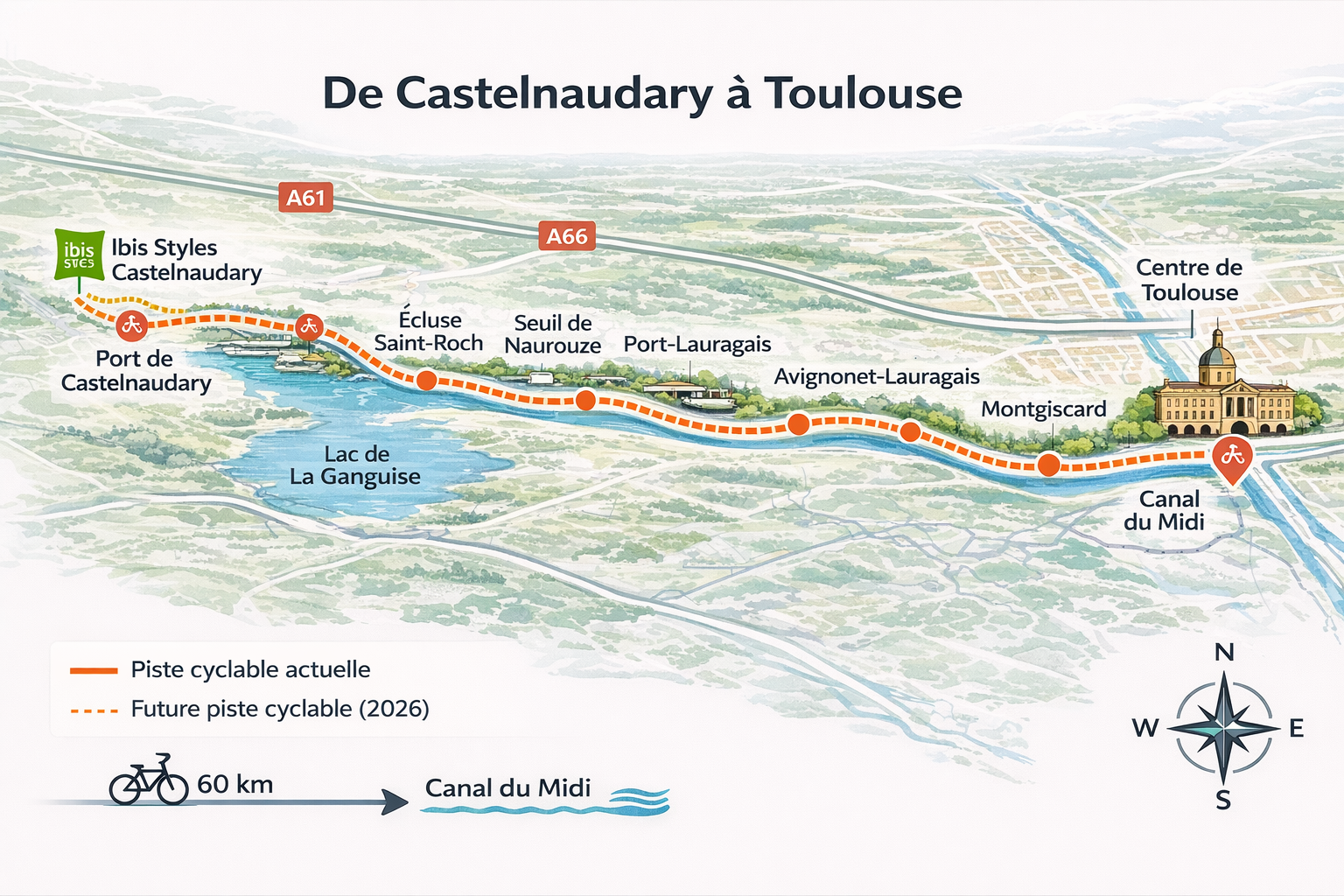 Situé à proximité de la voie verte du Canal du Midi, l’Ibis Styles Castelnaudary est une halte idéale pour les cyclotouristes entre Toulouse et Carcassonne, avec des services adaptés pour se reposer et repartir sereinement.